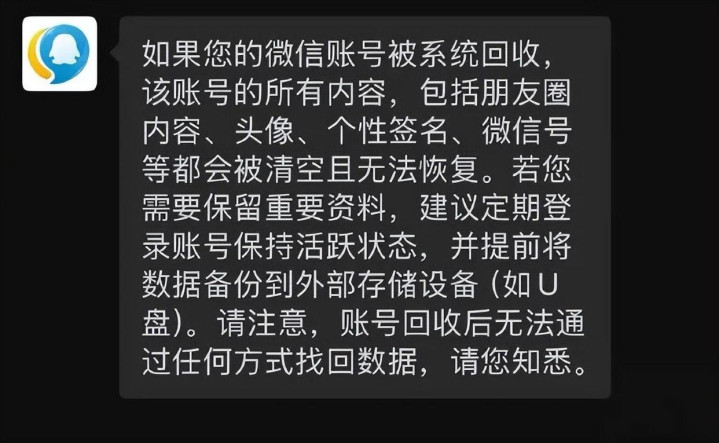 另外,微信客服还表示,如果微信账号被系统回收该账号的所有内容,包括朋友圈内容、头像、个性签名、微信号等都会被清空且无法恢复。若需要保留重要资料,建议定期登录账号保持活跃状态,并提前将数据备份到外部存储设备(如U盘)。请注意,账号回收后无法通过任何方式找回数据。
